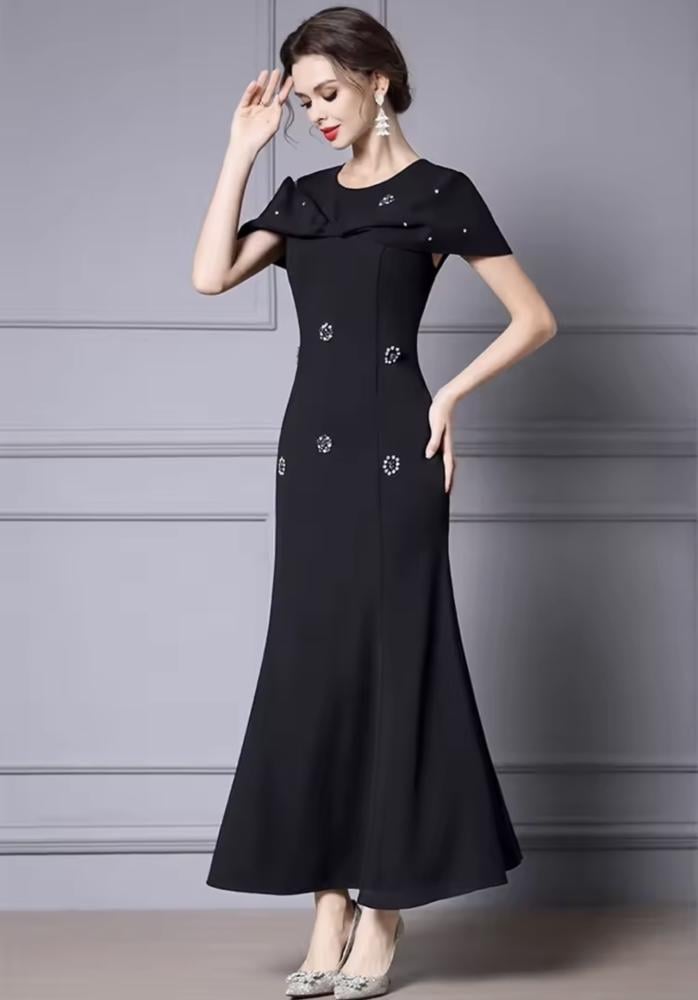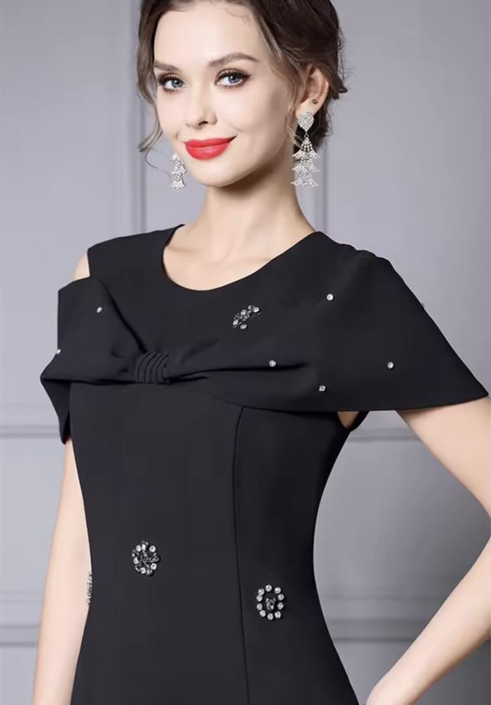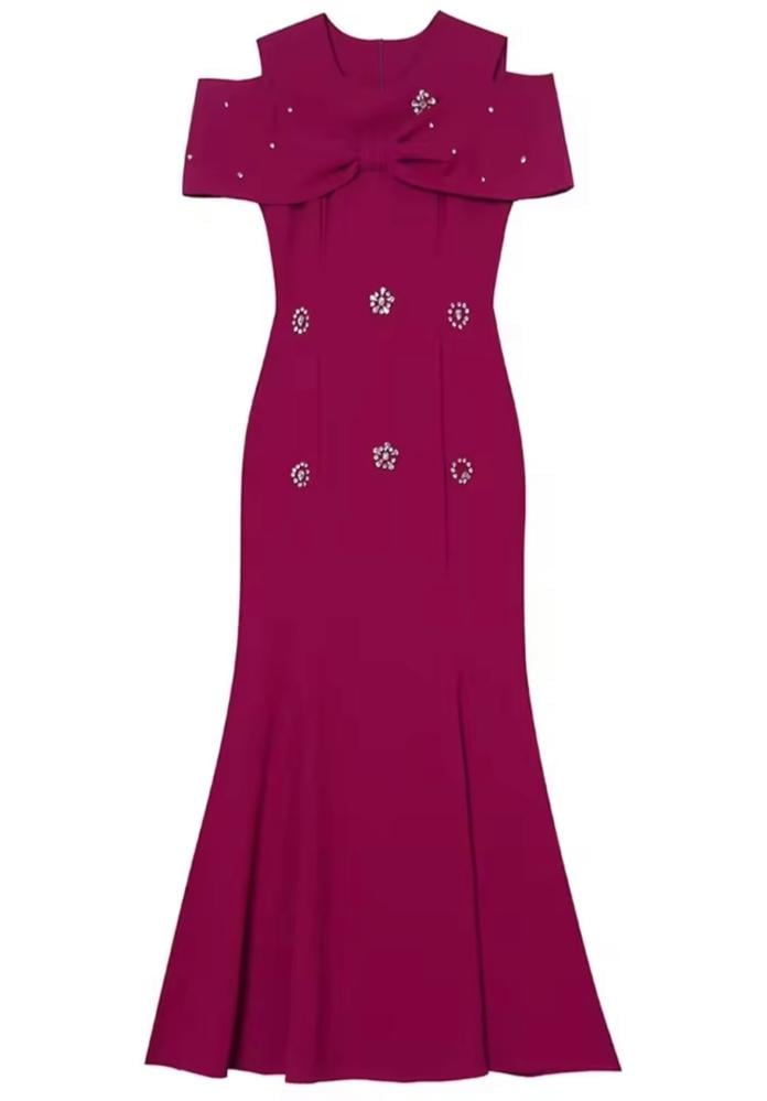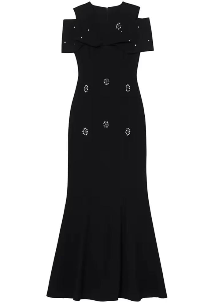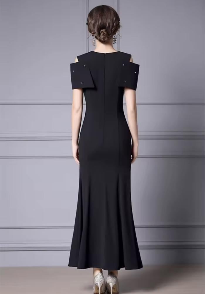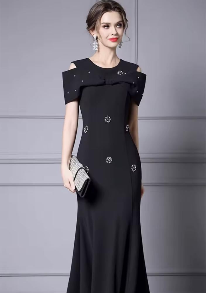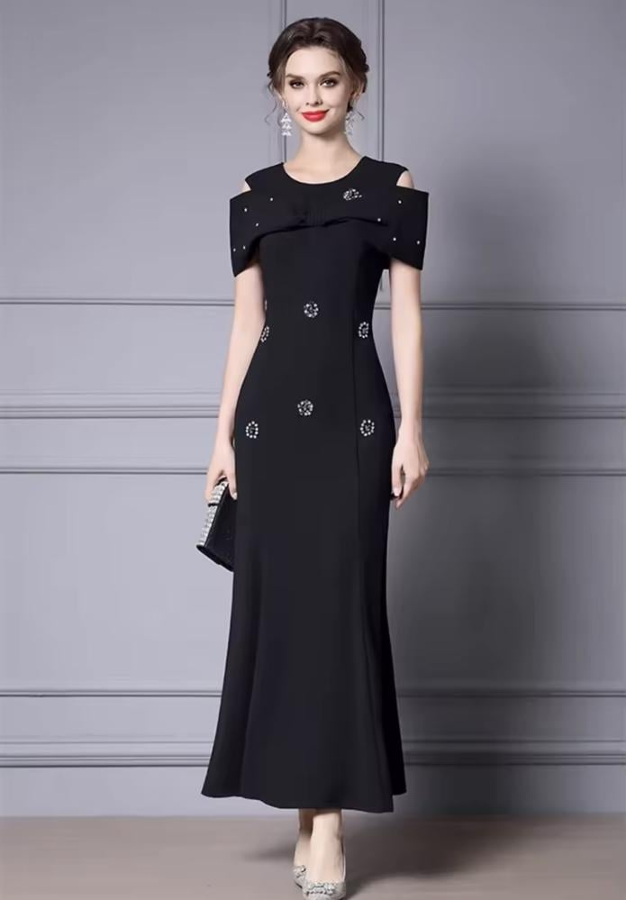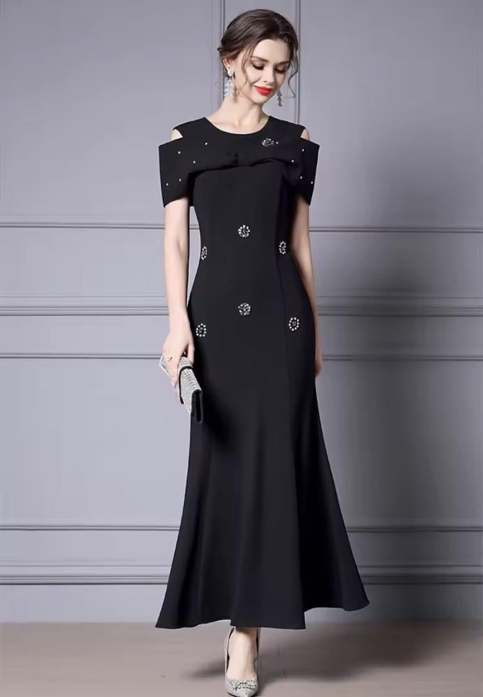 فستان جاهز للسهرات والمناسبات أنيق بقصة كتف مفتوحة وتفاصيل لامعة