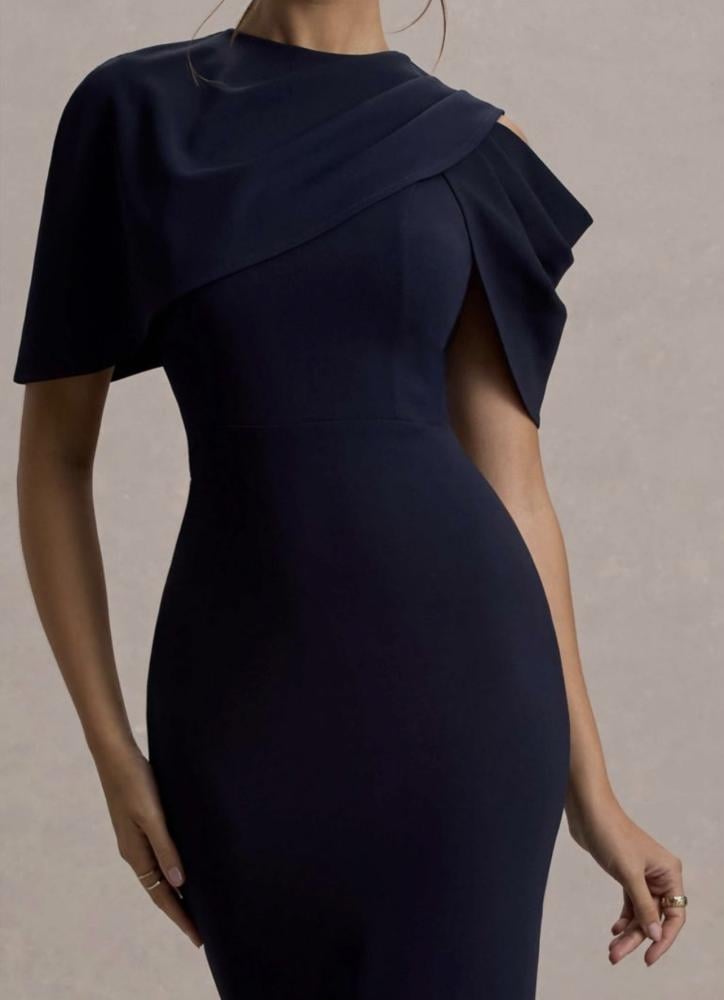 فستان أنيق وبتصميم جرئ وأناقه عصرية، ، صُنع هذا الفستان الأزرق الداكن متوسط الطول من كريب سكوبا الفاخر، ويتميز بكاب أنيق ينسدل بسلاسة، ليضفي لمسةً من الحركة والأناقة على إطلالتكِ. يُضفي الجزء العلوي المُنسدل باحترافية لمسةً من الأناقة، ويُبرز قوامكِ بكل سهولة ويسر. اجعلي هذه القطعة الأساسية في إطلالتكِ المسائية مع حذاء بكعب عالٍ أنيق وإكسسوارات جريئة، لإطلالةٍ آسرة لا تُنسى في مناسبتكِ القادمة.