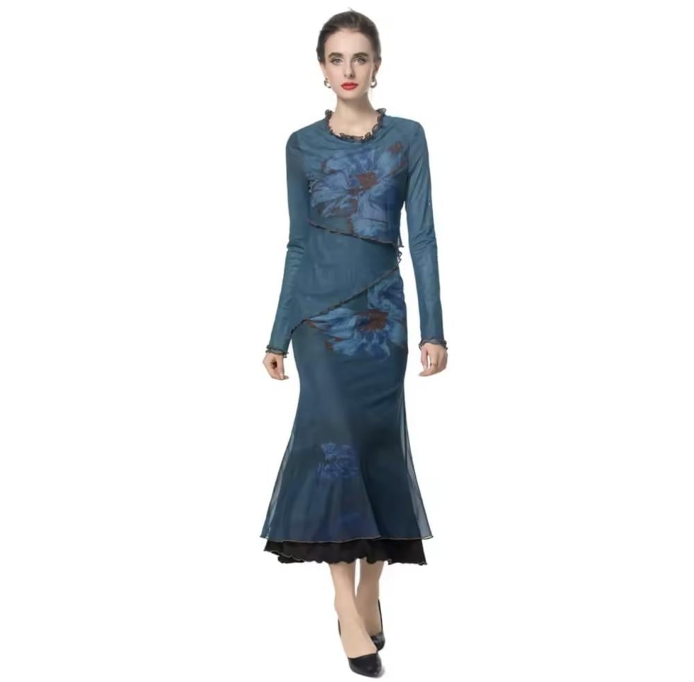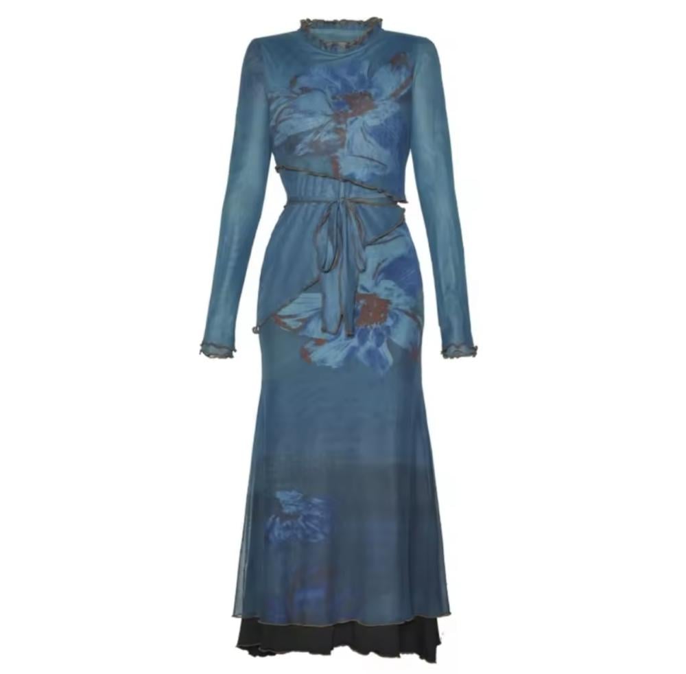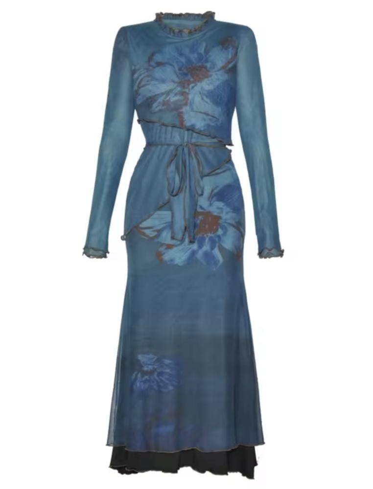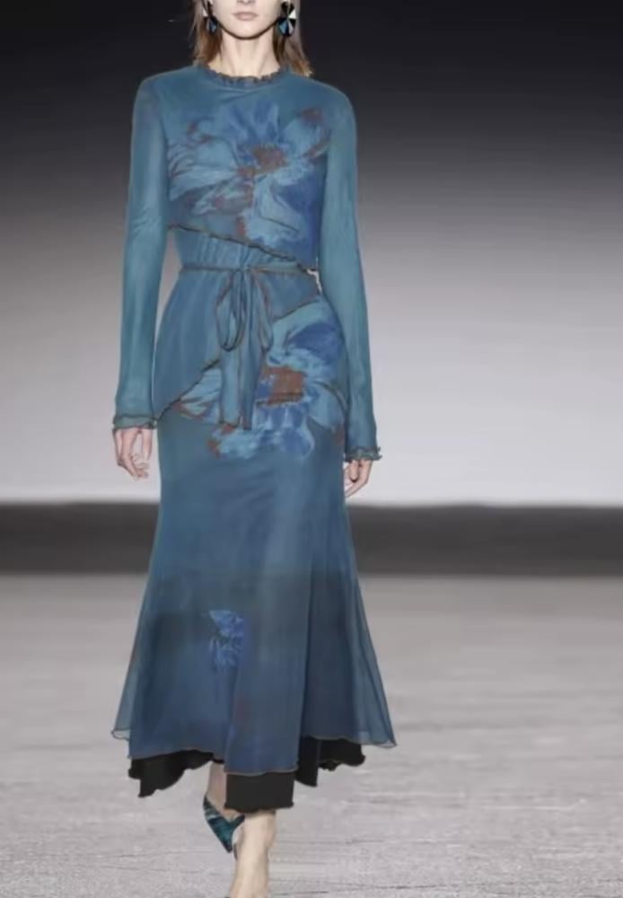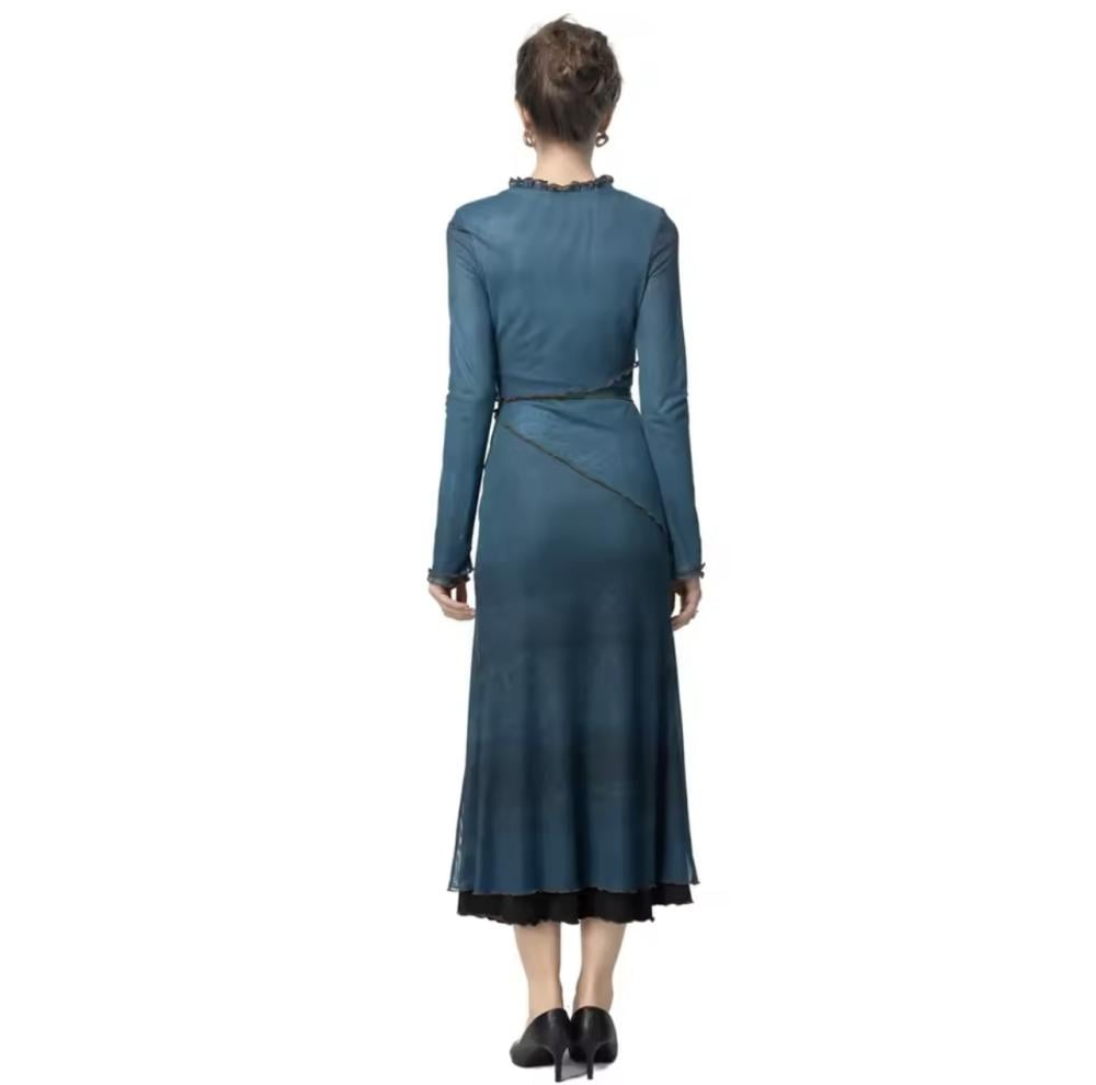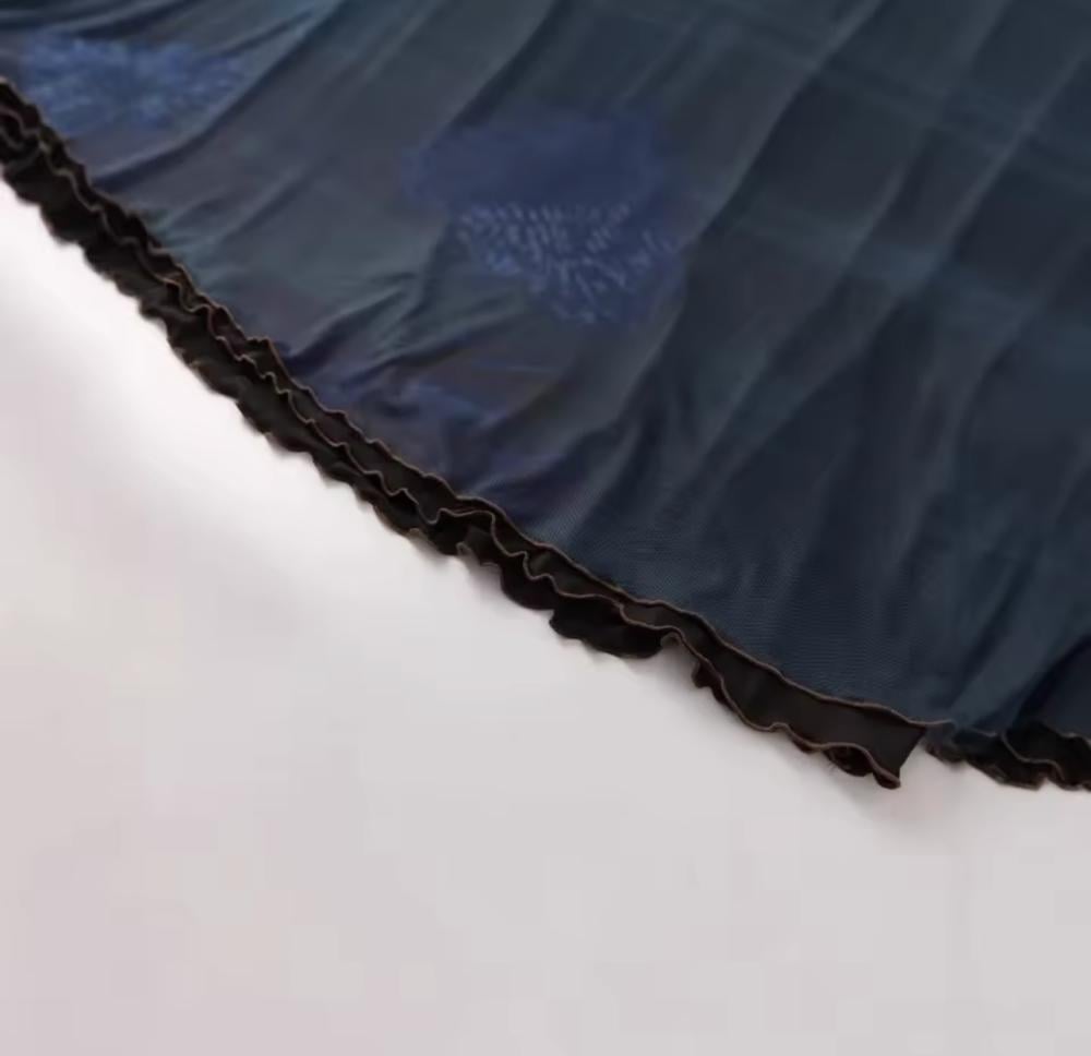 • الفستان طويل بأكمام طويلة، وله عنق عالي مزين بحافة منقوشة بريشة رقيقة باللون الأزرق الفاتح مع حافة بني غامق.