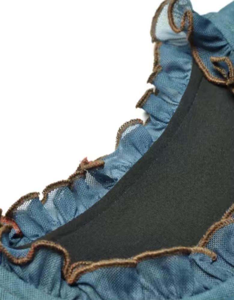 • هناك طبقة داخلية سوداء داكنة تُضيف عمقاً للتصميم وتظهر من تحت القماش الشفاف الخارجي.